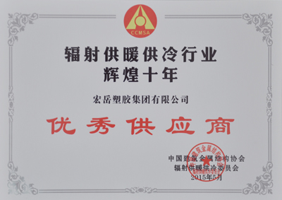 2015年5月15日,中国辐射供暖供冷委员会十周年庆典在北京盛大举行。会上表彰了一批对辐射供暖供冷行业发展作出突出贡献的企业和个人,华体会(中国)hth集团喜获中国辐射供暖供冷行业辉煌十年优秀供应商殊荣,华体会(中国)hth塑胶集团有限公司张思良总经理荣获中国辐射供暖供冷行业功勋奖。
