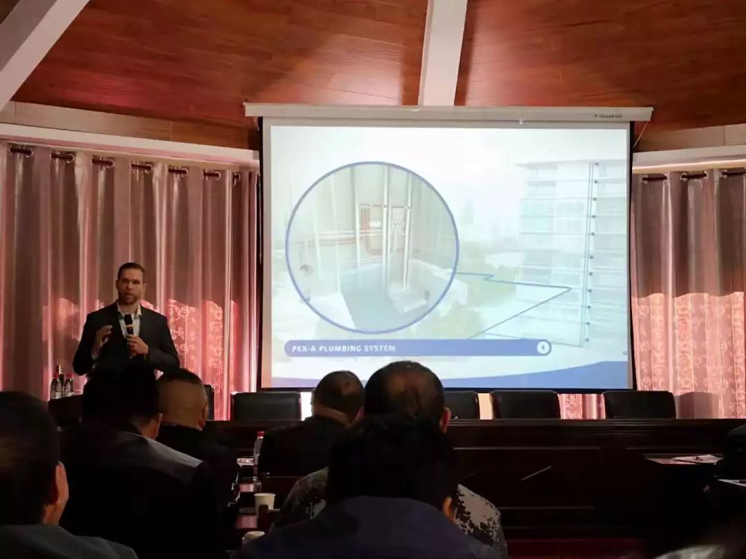 会议伊始,首先由华体会(中国)hth集团美国公司技术总监John先生,为大家详尽介绍了PE-Xa零漏点给水系统的性能优势及该系统在美国乃至国际市场上的广泛应用情况,让参会人员对国际领先的产品系统与应用技术也增进更深的认识与了解。